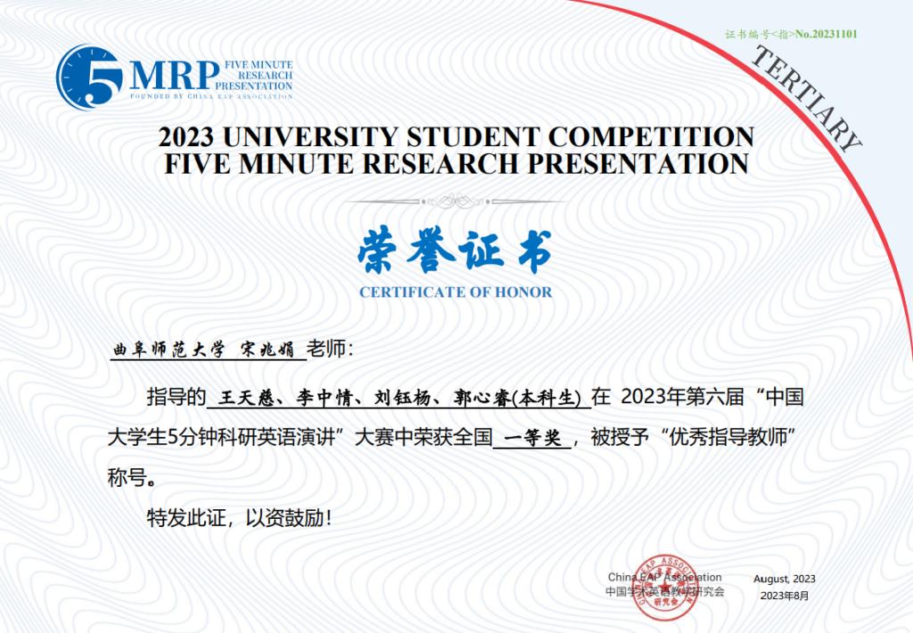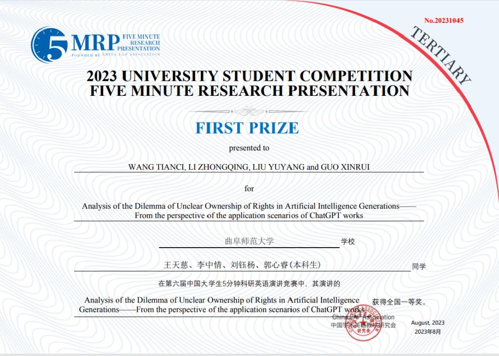 日前,第六届中国大学生5分钟科研英语演讲竞赛决赛(非医科类)在同济大学成功举行。由曲阜师范大学选拔推荐的16支团队取得优异成绩,获得全国一等奖1项、二等奖6项、三等奖9项。其中,由王天慈、李中情、刘钰杨、郭心睿等四位同学组成的团队作品“Analysis of the Dilemma of Unclear Ownership of Rights in Artificial Intelligence Generations — From the perspective of the application scenarios of ChatGPT works”荣获全国一等奖。此外,其他16支参赛队伍分获校级一、二、三等奖。宋兆娟、李梦实等25位老师荣获优秀指导教师奖。