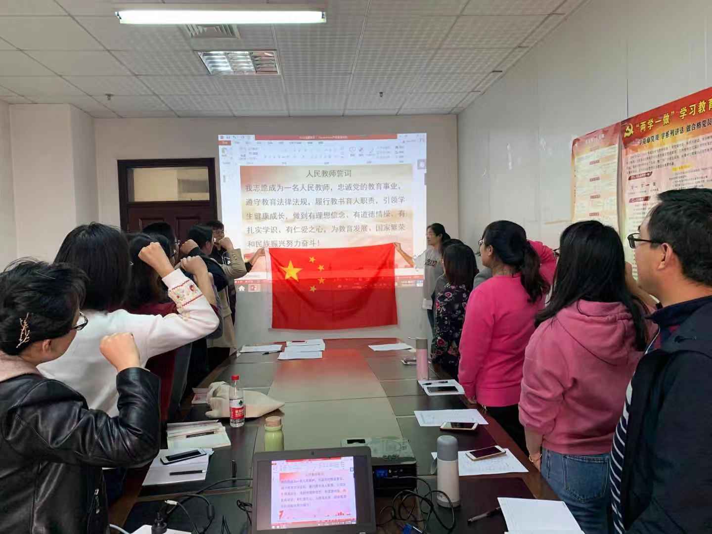 本次主题党日结合支部教师职业特点和专业特色,共分为5个方面内容。第一,在日照校区机关党委的统一安排下,观看电影《我和我的祖国》。作为庆祝中华人民共和国成立70周年的献礼片,《我和我的祖国》以大时代下的小人物为切入视角,精彩再现了新中国成立以来的七个重要历史时刻,展现了70年间中国人民不屈不挠、奋发图强的精神风貌。第二,认真学习了习近平总书记在庆祝中华人民共和国成立70周年大会上的中、英文版讲话内容。第三,就习近平总书记讲话精神和观看影片的感受进行了持久的交流探讨,与会党员纷纷表示正是依靠中国共产党的坚强领导,今日之中国,如初所愿。作为新时代的人民教师,要紧跟习总书记的步伐,不忘初心,不负重托,不辱使命,做有理想信念、有道德情操、有扎实学识、有仁爱之心的好老师。第四,与会党员面向国旗,面向人民教师誓词,庄严地宣誓,将活动推向高潮。第五,认真研读卢卫中老师的文章:《习近平治国理政话语的隐喻系统及语言魅力—以从严治党论述为例》,积极探索党建工作与业务工作的融合之道。