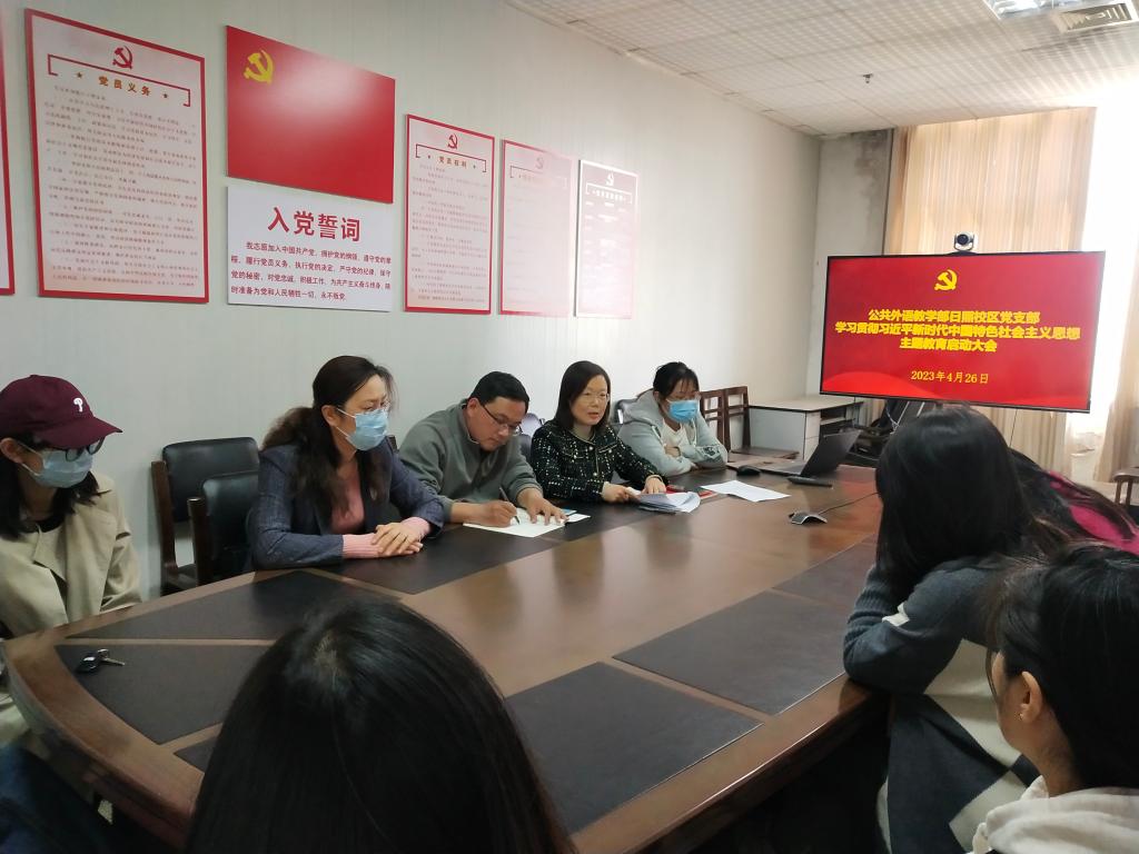日照校区党支部在JC1002会议室召开学习贯彻习近平新时代中国特色社会主义思想主题教育启动大会,支部书记杜庆凤主持,全体党员参加。
