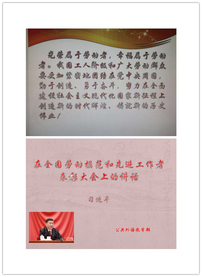 全体教职工共42人在部领导和工会主席的带领下,在阶梯教室开展了学习《习近平总书记在全国劳动模范和先进工作者表彰大会上的讲话》的专题活动。