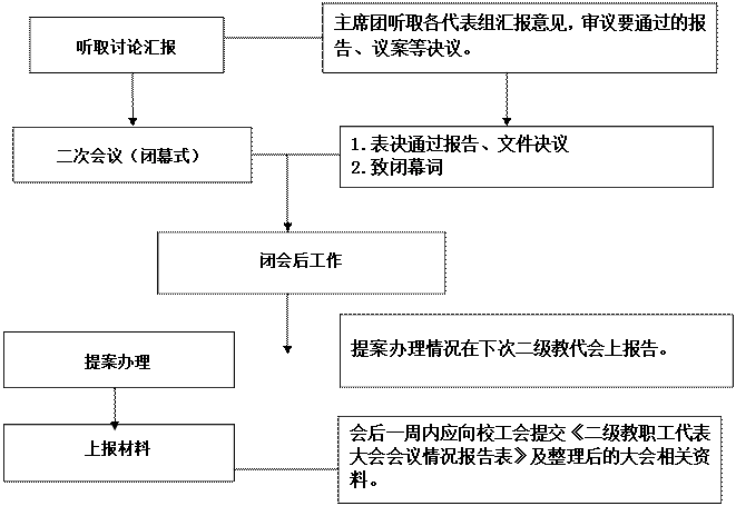 4. 二级单位工会在同级党组织的领导下负责二级教代会的筹备组织工作。请各单位工会利用学年末、学年初的时间节点组织召开二级教代会,会议内容可以与单位工作年终总结会、年初工作动员会结合起来。校工会对二级教代会工作提供协助与指导。