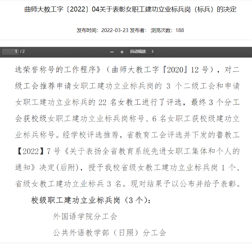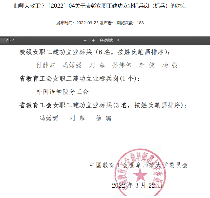 老师荣获曲阜师范大学“校级女职工建功立业标兵”个人荣誉称号。
