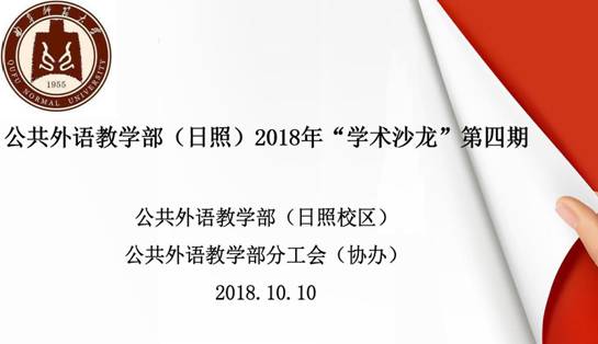 (日照校区)2018年第四期“学术沙龙”在JC1002会议室举行。本期沙龙邀请了公丕民、门超元、牟晓等三位老师分别作了题为“基于需求分析的大学英语教学定位”、“中外英语学习者学术论文写作结论部分的身份构建对比研究”、“‘一带一路’战略下中国传统文化在大学英语教学中的融入”的学术报告。本期活动由副教授张英主持,全体教师参加了研讨。