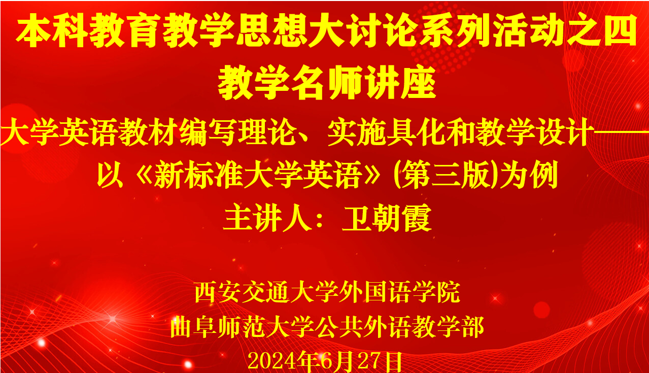 举办本科教育教学思想大讨论系列活动之四:教学名师讲座,特别邀请西安交通大学外国语学院卫朝霞副教授作题为“大学英语教材编写理论、实施具化和教学设计——以《新标准大学英语》(第三版)为例”的专题报告。活动由NBA篮球直播
