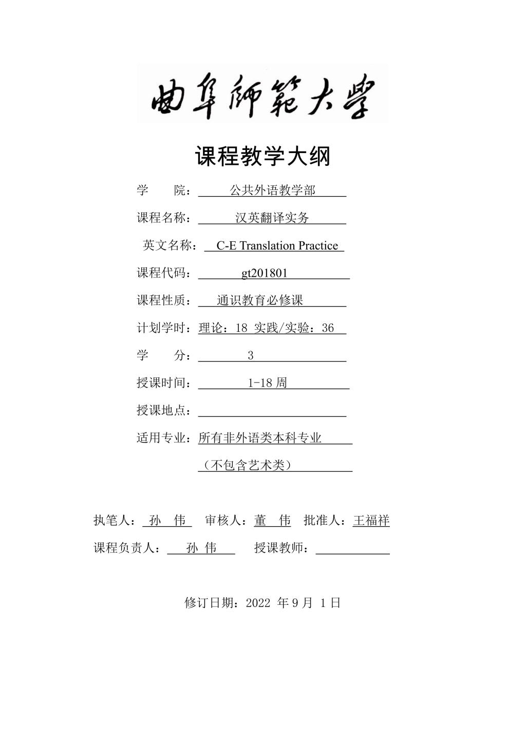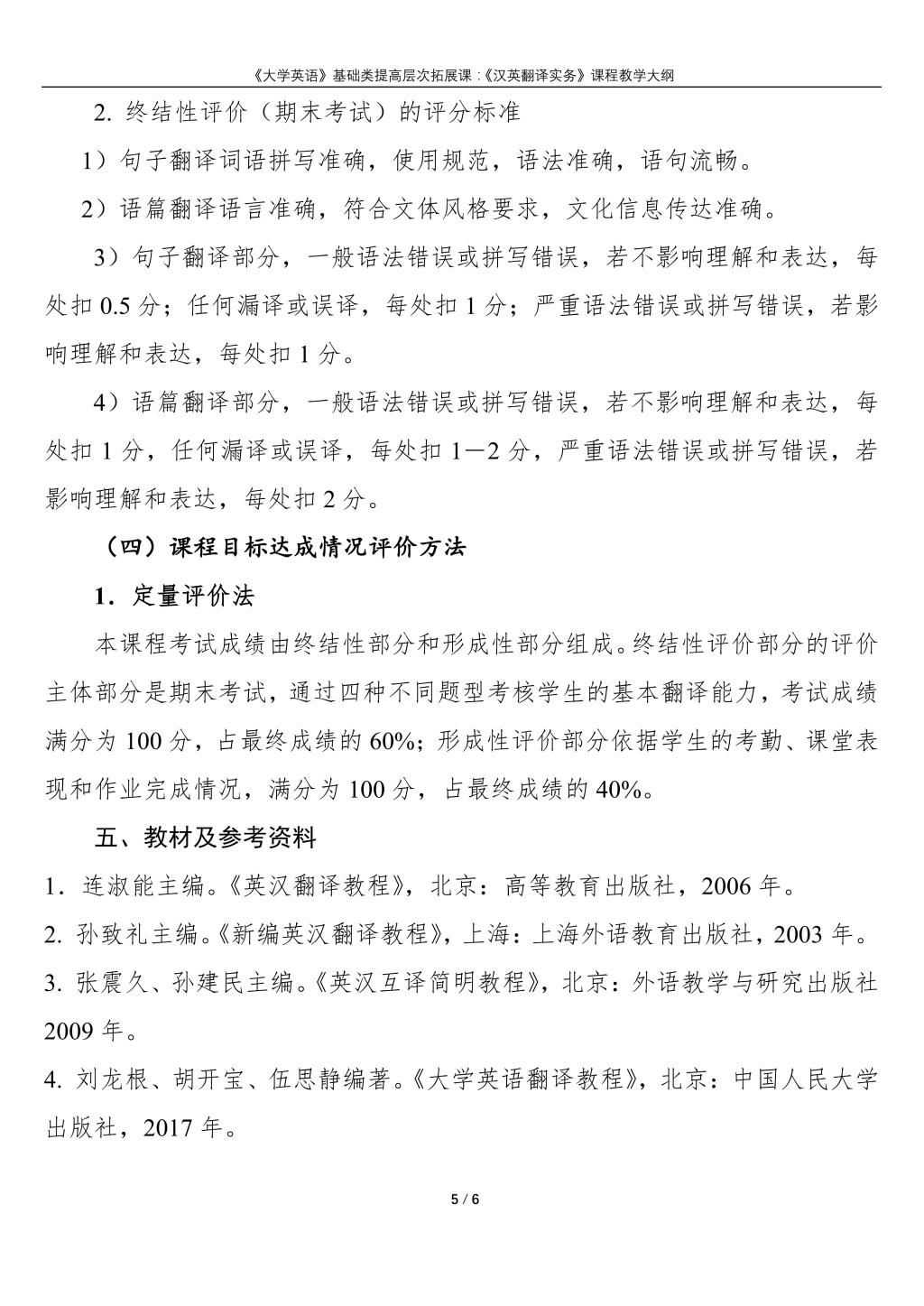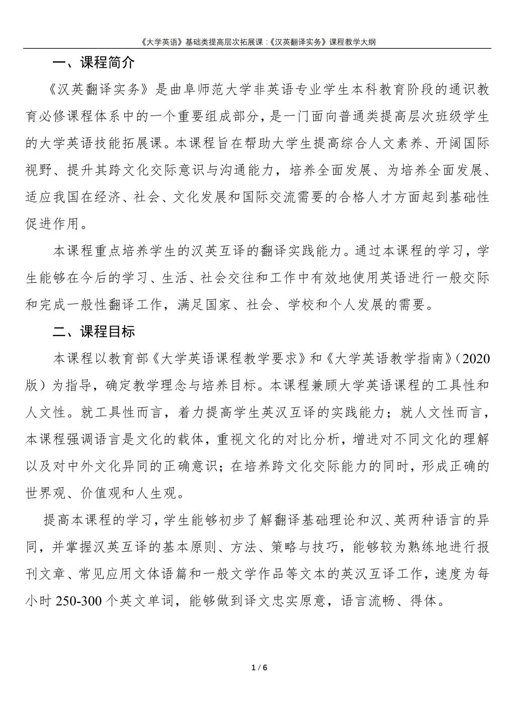 大学英语(普通类提高层次拓展课:《汉英翻译实务》)课程教学大纲(2022版)