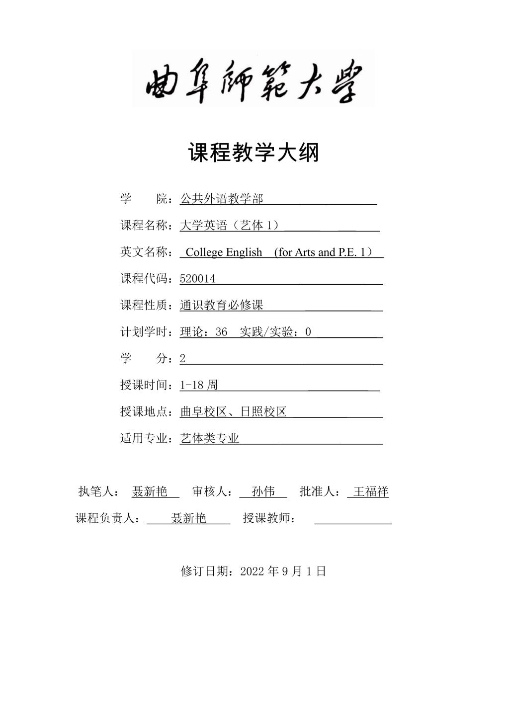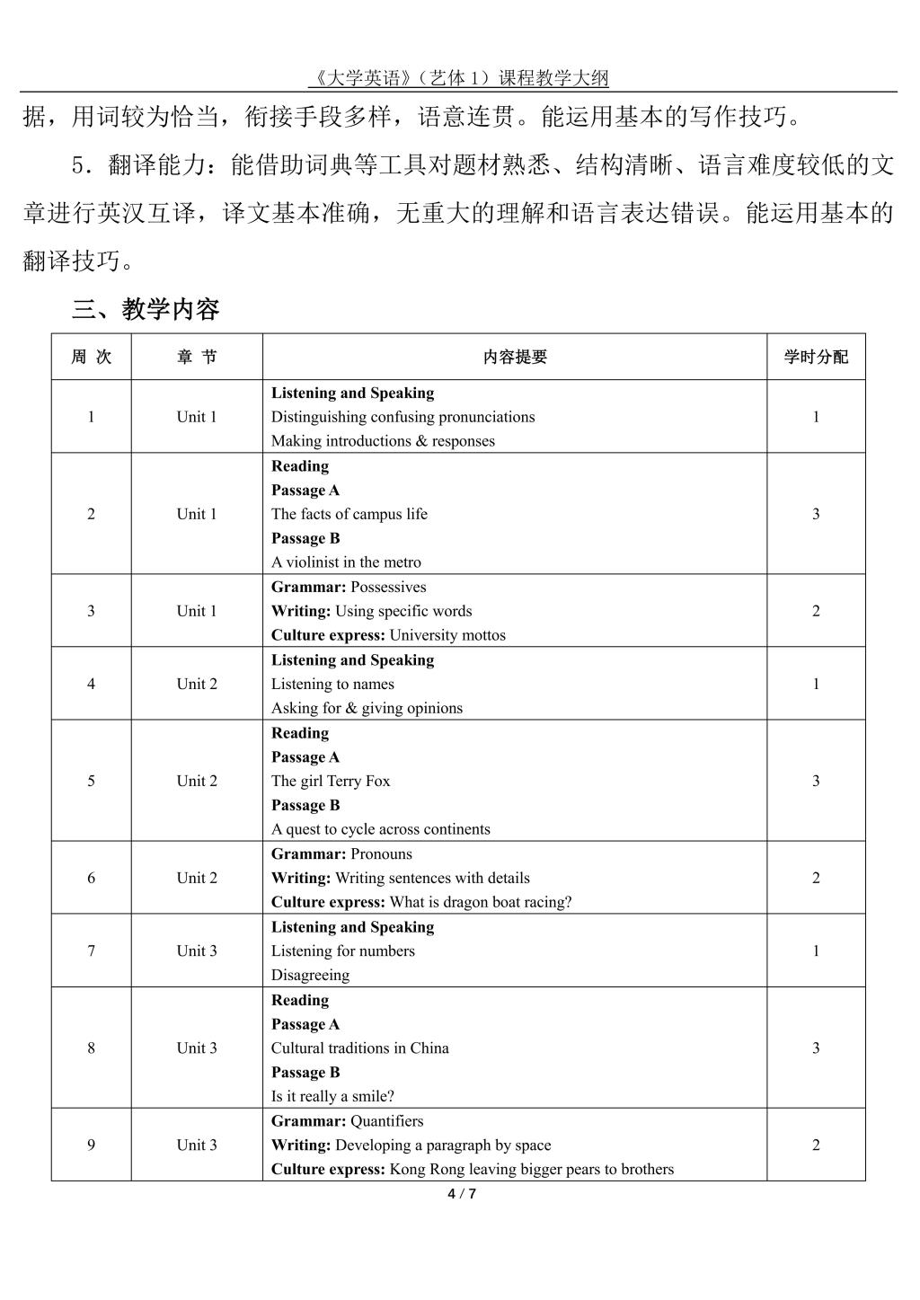 大学英语(艺体1)课程教学大纲(2022版)