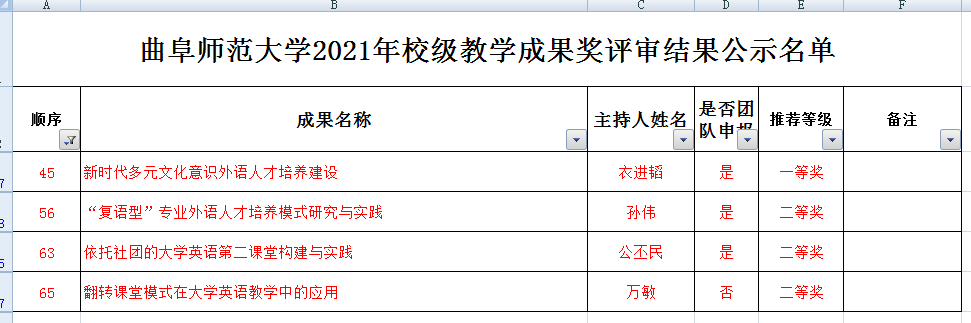按照山东省教育厅和我校《关于开展2021年校级高等教育教学成果奖评选工作的通知》要求,我校组织了2021年校级教学成果奖评审,经个人申报、学院排序推荐、学校资格审核、初审和专家终审等环节,共评定教学成果奖特等奖22项、一等奖23项、二等奖23项。其中NBA直播LINE 衣进韬老师获得一等奖,孙伟老师、公丕民老师、万敏老师获得二等奖。