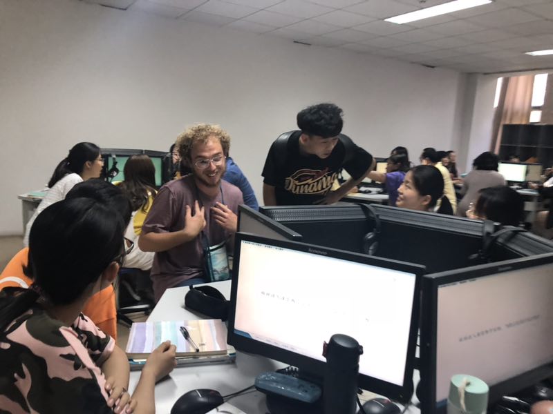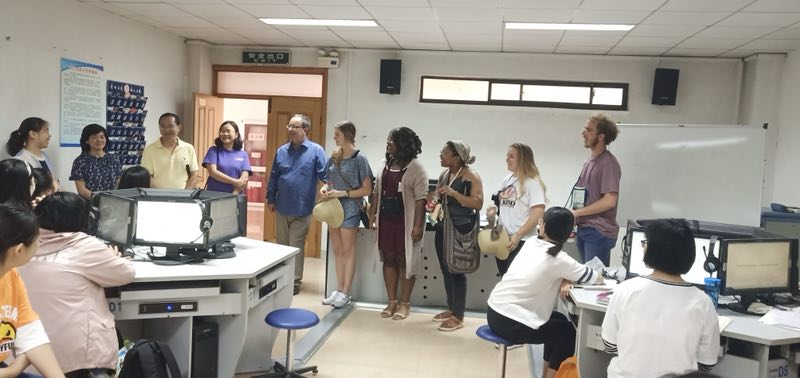 虽然天气炎热,师生们仍将到校后第一站选在NBA直播LINE 位于实验中心的A311语音室进行课堂观摩,希望和学生们进行互动交流。NBA直播LINE 三级起点周四班同学和仲蕾老师对他们的到来表示了热烈的欢迎。代表团成员做了简单的自我介绍,随后坐到同学们身边。仲蕾老师向来访师生介绍了NBA直播LINE NBA篮球直播多媒体语音室的使用情况,大学英语教学的课程设置和开展现状。随后,来访师生加入班级学习小组,由我校同学带领参观校园,开始了一堂户外英语听说课。