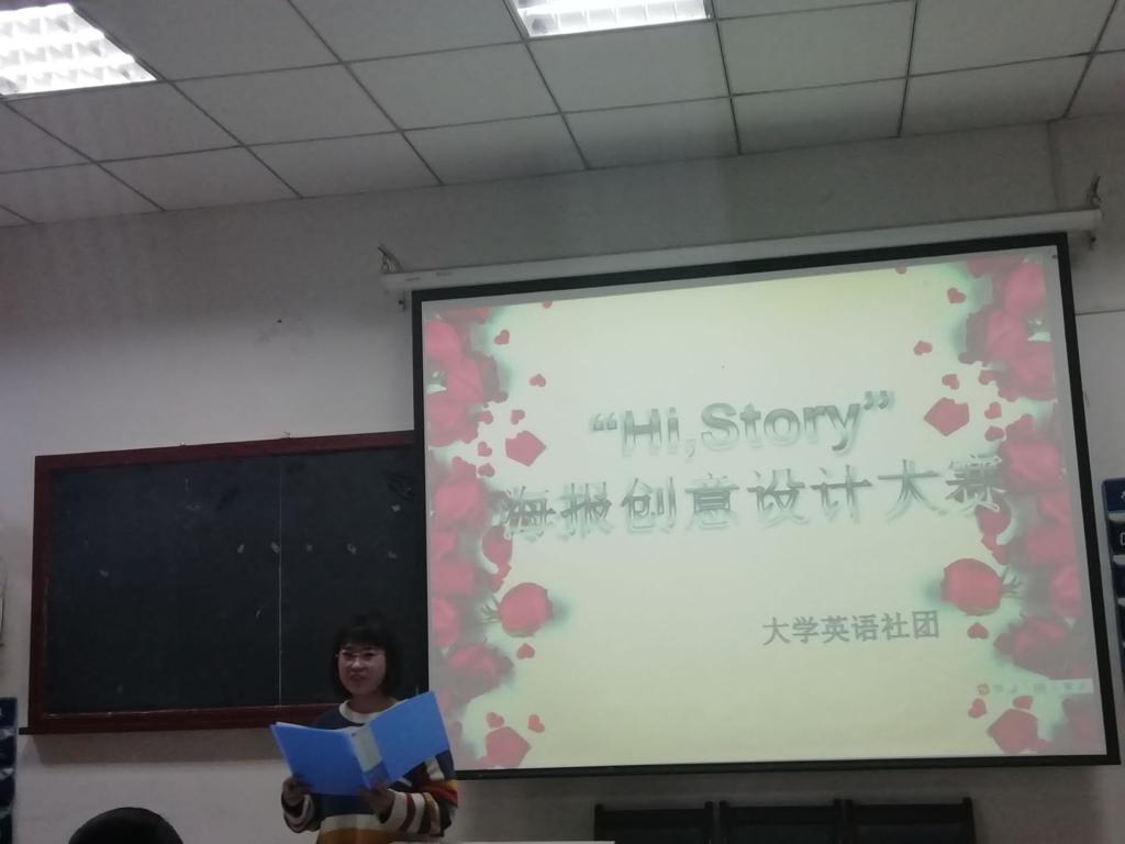 为激发同学们英语学习的兴趣,提高大家的英语素质,大学英语社团于2018年11月11日在文史楼510教室举办了首届“Hi,Story”海报创意设计大赛决赛。