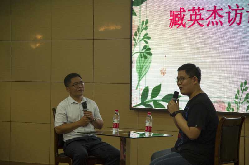 教师李文彬老师登上讲坛。李老师首先邀请臧英杰同学用英语做了简短的个人介绍,并发表了即兴演讲。英杰同学标准流畅的发音、自然大方的肢体语言、理性又不失幽默的表达方式瞬间点燃了交流会现场的气氛。接着访谈双方在“回顾2016年外研社杯演讲大赛、2018年21世纪杯全国演讲比赛夺冠历程”、“IPSC国际公开演讲比赛赛制”、“英语演讲制胜关键因素”、“如何平衡英语学习与专业课学习的关系”等六个方面的内容展开对话。交流会现场气氛十分热烈,不时被英杰同学的坦诚又睿智、大方又幽默的言谈点燃,掌声不断、笑声不断。访谈交流会的最后一个环节,现场的听众和臧英杰同学展开热烈的互动,听众提问的问题涉及范围很广,既有CET考试通关技巧方面的又有如何备战2018年外研社杯演讲大赛方面的,英杰同学耐心地对问题做了一一解答。在总结发言中,臧英杰同学指出,“演讲的制胜法宝不外乎有一颗真诚交流的心和一个引人入胜的观点”。在热烈的掌声中,本次访谈交流会落下帷幕,访谈交流会在引导同学们“端正英语学习动机”、“激发英语学习兴趣”等方面收到了取得了良好的效果。